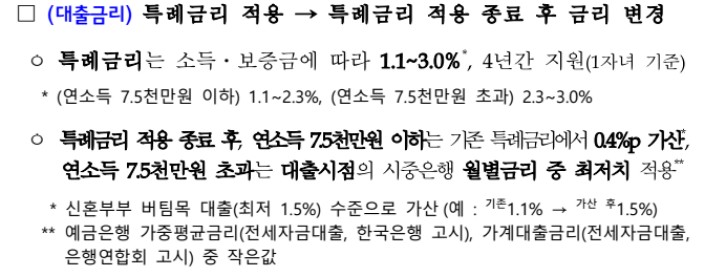2) 특례금리 종료 후, 연소득 7.5천만 원 이하는 기존 특례금리에서 0.4% 가산(신혼부부 버팀목 대출(최저 1.5%) 수준으로 가산 (예 기존 1.1% →가산 후 1.5%))