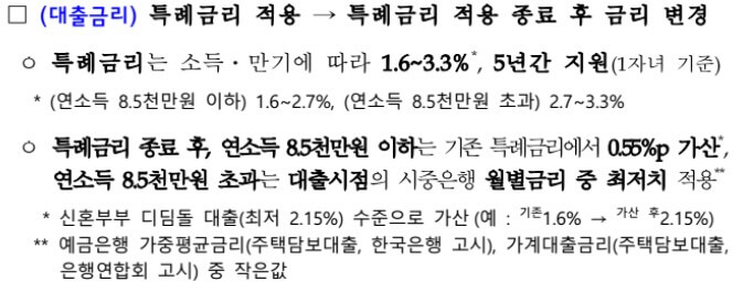 2) 특례금리 종료 후, 연소득 8.5천만 원 이하는 기존 특례금리에서 0.55% 가산(신혼부부 디딤돌 대출(최저 2.15%) 수준으로 가산 (예 기존 1.6% →가산 후 2.15%))