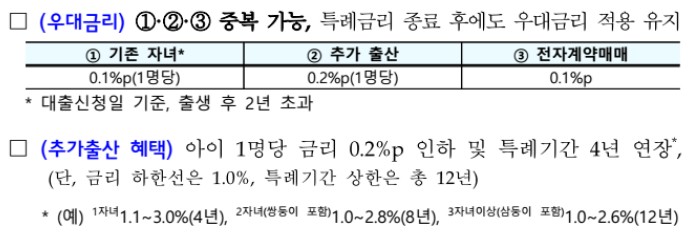 1) 특례금리는 소득, 만기에 따라 1.6%~3.3%,5년간 지원(1자녀 기준)
