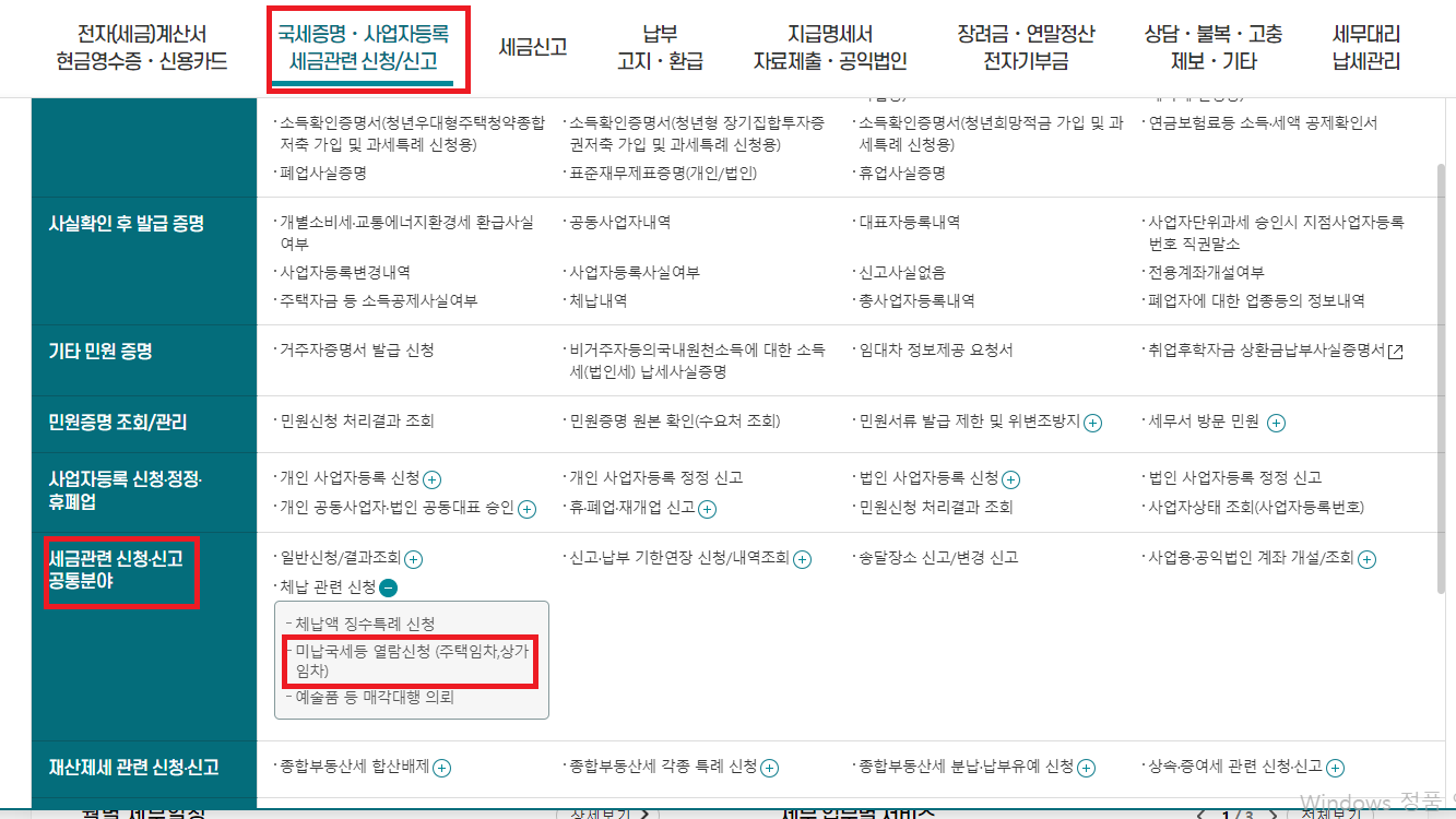 국세증명. 사업자등록 세금 관련신청/신고 → 세금 관련 신청. 신고 공통분야 → 미납국세등 열람신청(주택임차, 상가임차) 그다음 간편 인증으로 로그인 후 인적사항을 확인합니다.